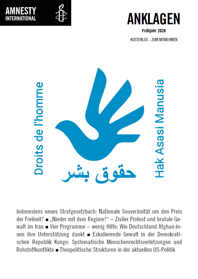Amnesty International ist eine weltweite, von Regierungen, politischen Parteien, Ideologien, Wirtschaftsinteressen und Religionen unabhängige Mitgliederorganisation. Auf der Grundlage der Allgemeinen Erklärung der Menschenrechte wendet sich Amnesty International gegen schwer wiegende Verletzungen der Rechte eines jeden Menschen auf Meinungsfreiheit, auf Freiheit von Diskriminierung sowie auf körperliche und geistige Unversehrtheit.