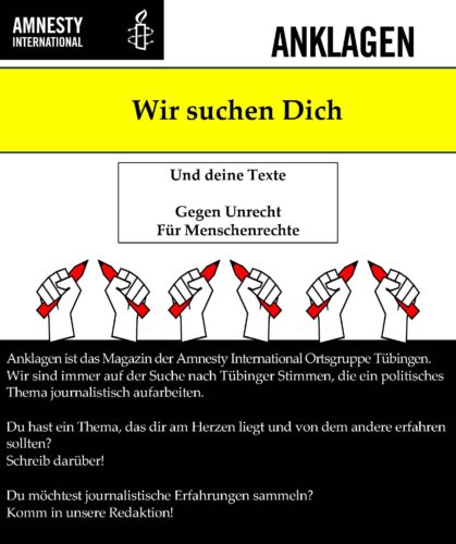 Wir treffen uns nach Absprache im Tübinger Amnesty-Büro in der Wilhelmstr. 105 (im Glasanbau, Untergeschoss).